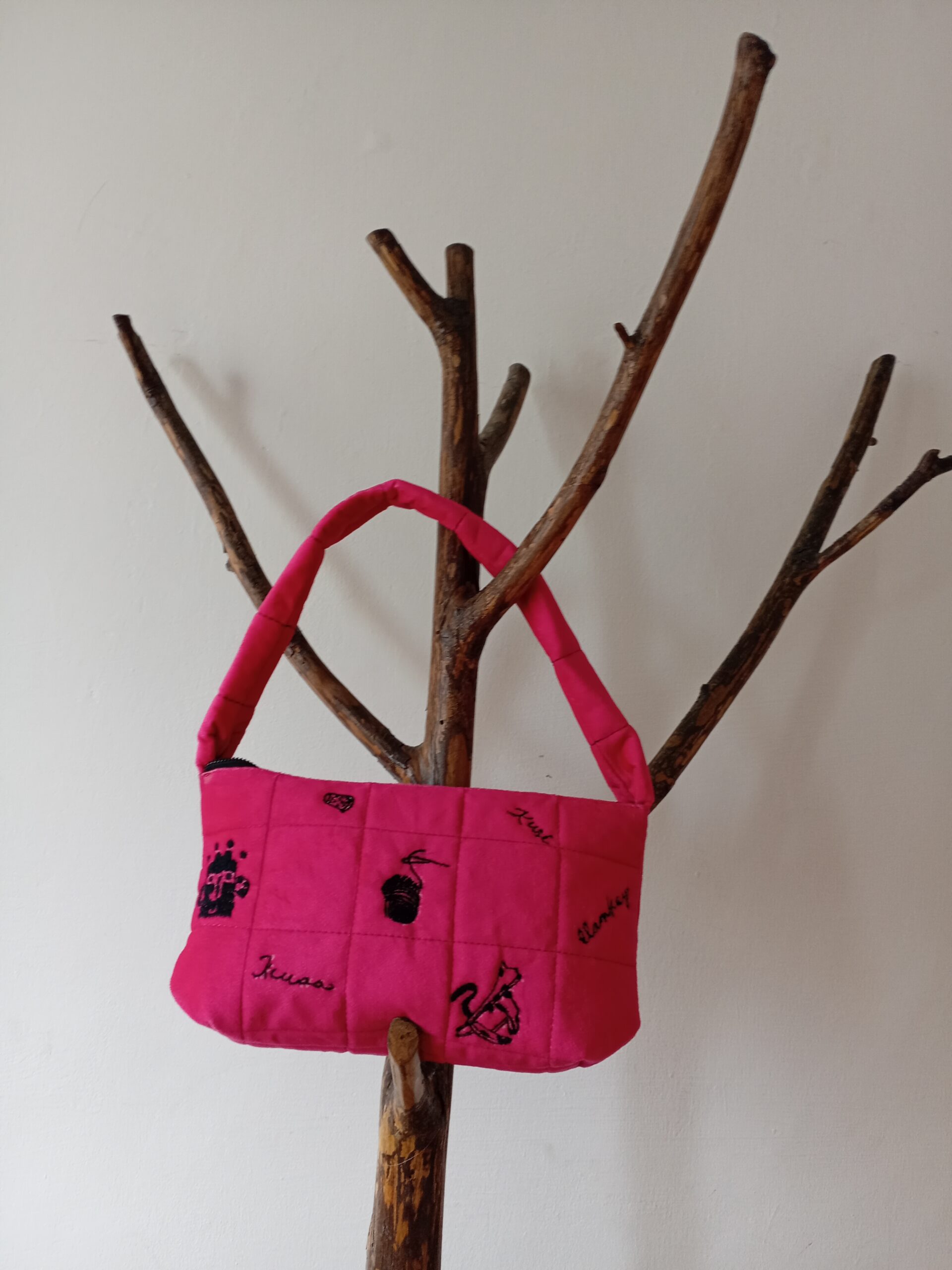 Materials: 70 cm x 45 cm of Mic Plain Sublimable fabric, 16 meters of 100% washable cotton embroidery thread, black color. Measurements: Gusset width: 10 cm, Width: 32 cm, Height: 36 cm, Strap height: 40 cm, Base width: 22 cm. 22 hours of embroidery.